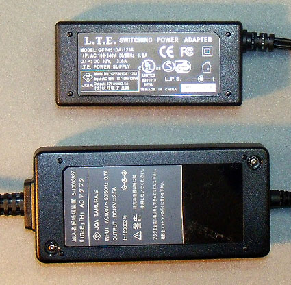 | ということで、実力としてどのような負荷特性を持っているのか調べてみた。 比較対象として、秋月電子で入手したACアダプタも測定する。 右の写真で、上が秋月で入手した「 12V3.8A」品、 下が放出品の 「12V2.5A」品で 1廻りほど 大きい。 |