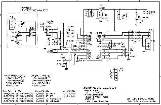 あるが、今回は既に使用経験のあった CS8416とした。 このチップの特徴としては、各種モードの設定を ジャンパ等で設定する