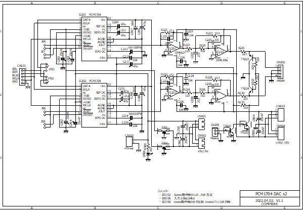 それでは PCM1704/DF1706の datasheetを ダウンロードし回路をチェックします。 PCM1704 datasheet ![]() なんと 5V電源が、プラスマイナスの 2電源必要! とのこと、 これは面倒ですね~ 手持ちの基板で ±対応できる基板は ディスクリート タイプがありますので それを ±5V対応することに します。 ディスクリート電源は こちら ディスクリート±5V電源基板 ![]() 接続端子は、EHタイプでは ±15Vと混乱しますので ±5Vでは、HXタイプを使用することにします。 (この基板以外に ±15V も必要です) HXコネクタ ![]() 手前:XH±5V用、 奥側:EH-2/5V用 DF1706基板には DAI (CS8416) も搭載します。 ハード設定で行けるようにしたいのですが Volを 操作したいこともありそうなので、MPU も搭載し ソフト制御できるように ・ ・ ・ などと欲張った結果 ミスで試作基板は ジャンパー多発 です デジタルフィルターICの使用は初めてですが なかなか こっちの思った通りに 動きません。 ちょっと 手強い? CS8416 + DF1706 DAI試作基板 ![]() こちらは、PCM1704基板です。 こちらも対応インターフェースが特殊で どうも分かりにくい ・ ・ ・ PCM1704x2 DAC試作基板 ![]()