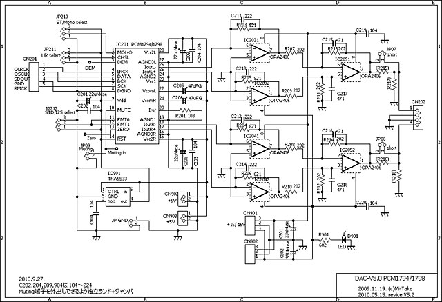 | (V5.以降) ・ DAC用 IC : BurrBrown製 PCM1794 又は PCM1798 (24bit、8倍オーバーサンプリング、差動電流出力) ・ I/V変換用 IC : BurrBrown製 OPA2604 x 3 又は TI製 NE5532 x3 ・ 電源 : +5V 、±15V (CN903、CN901) 予備コネクタ(他基板へのデイジーチェーン用)付き。 ・ 入力 : DAIと接続 (CN201) 3.3Vpp DataFormat = Rightjustify(STD) I2Sに設定可能 ・ 出力 : アナログ出力 (CN202) 4.5VRMS または、 2.3VRMS/PCM1798の場合 ・差動シングルエンドコンバータ fc : 169KHz ・ 基板サイズ : 72o X 47o ・ 基板材質 : FR-1 両面スルホール ・ 設定項目 : 半田ジャンパーにて PCM mode , Mono/Stereo, Lch/Rch 切換設定可能 技術的な詳細は こちら に回路・基板設計時の情報があります。 |