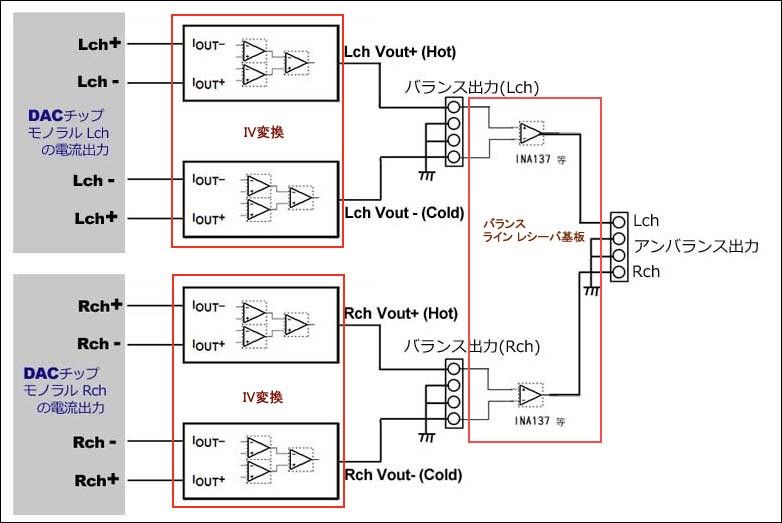 次に、モノラル動作時の概念図を示しまします。 基板1枚で、Lch(又はRch)の片側のみの動作となります。 I/V回路で電圧変換された出力は、バランス出力となりますので、バランスレシーバ基板 等で (Hot) (Cold) 信号を合成し、アンバランスに変換する必要があります。 この時に、電圧加算されるので、S/Nレシオ等が改善される訳です。 ある意味では、D/A変換部をパラレルで使用するのと 同じような効果を狙っているとも言えます。 バランス-アンバランス変換無しでも、それぞれの基板の Hot-GNDから 直接出力を取れば アンバランス出力が得られますが、S/Nレシオ等の改善御利益は得られないことになります。 下の図の例は、差動バッファ基板(バランス→アンバランス変換)を入れた構成例です。 |