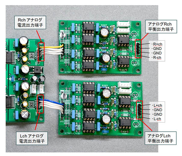 PCM1794/1798 基板の場合 と PCM1792/1796 基板の場合 ジャンパー設定の仕方が 異なります。 PCM1794/1798 STD ![]() PCM1794/1798の場合は、半田ジャンパーで ◆ ステレオ−モノラル設定と ◆ LchーRch設定を行います ![]() モノラルにするには、下図のように、 3個のパターンのうち上側の2個のみ 半田でショートさせます。 3個すべてショートしないようご注意ください。 ![]() Rch用の基板にするには、下図のように、 3個のパターンのうち上側の2個のみ 半田でショートさせます。 3個すべてショートしないようご注意ください。 ![]() PCM1792/1796の場合は、モノラル動作モード自体は 制御基板のジャンパーピンで切り替えますが、 (こちら) Lch−Rch設定はDAC基板の半田ジャンパーで設定が必要です。 DAC基板をRch専用に設定します。(Lch側はなにもしなくてOK) PCM1792/1796 STD ![]() ◆ Rch設定を行います JP番号が書いてないのでちょっと分かりにくいですが下記の通りです。 ![]() Rch用の基板にするには、写真の場所のジャンパーを 下図のように、3個のパターンのうち 左側の2個のみ 半田でショートさせます。 3個すべてショートしないようご注意ください。 Lch から Rch の設定に変更する ![]() 制御基板を使う場合の設定 制御基板をモノラル設定にするには、 説明書にある monoモード設定の位置に ジャンパーを入れます。 (または裏で半田でショートでOK) ![]() LCDが接続されている場合は、 Mono*2動作であることを表示します。 ![]() |