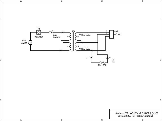 トランス基板の回路です ![]() とりあえず 基板内で完結するよう 電源スイッチと ヒューズ(ポリスイッチ)を内蔵しました。 ケースに入れる場合は、電源スイッチはオンにしたまま、ケースに付ける電源スイッチでon-offするようにします。 |