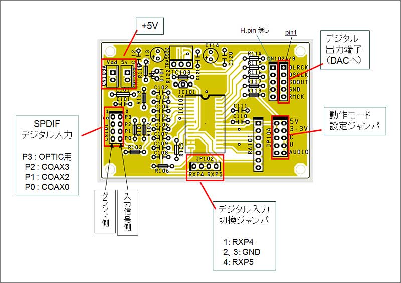 完成基板例 V2基板 V3基板から、光入力端子(3P)が独立しました。 上記デジタル入力端子の選択表で、RXP4/5の ジャンパー無しが相当します。 光端子を接続した場合 CN101のRXP3(COAX)は使用できません。 ![]() |